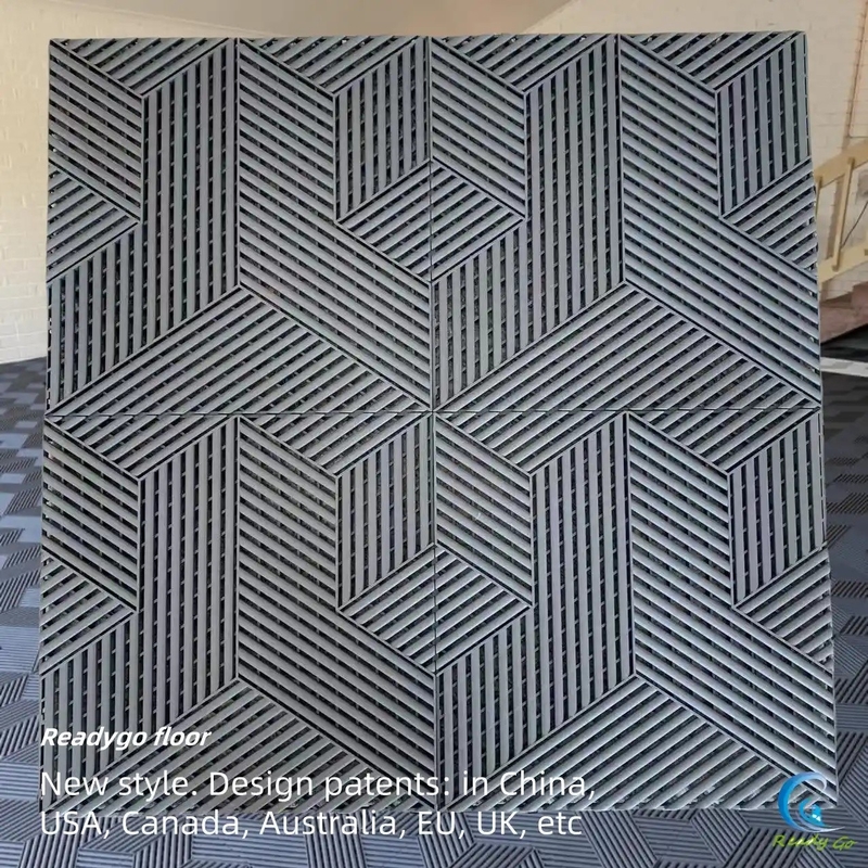 El color gris y el acabado de la superficie mate de la teja de suelo de garaje de plástico Readygo 3D cúbico asegura que se mezcle perfectamente con el resto de su decoración de garaje.puede cubrir fácilmente una gran área de su piso de garaje con facilidad.